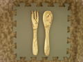 オリーブ材でできたスプーンとフォークのセット。 サラダなどのサーブに適したサイズです。